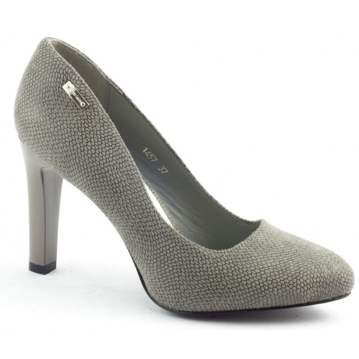 Bombas elegantes y universales en un tono gris que combinan el corte clásico con comodidad de uso. Un modelo con una nariz de almendras y un tipo de talón estable, ideal para la oficina y para salidas nocturnas.