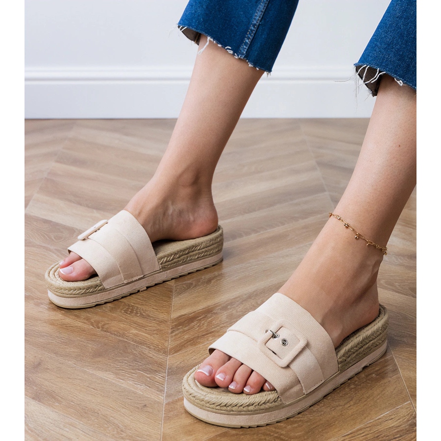 Detalles: Aletas beige en la plataforma con una hebilla decorativa