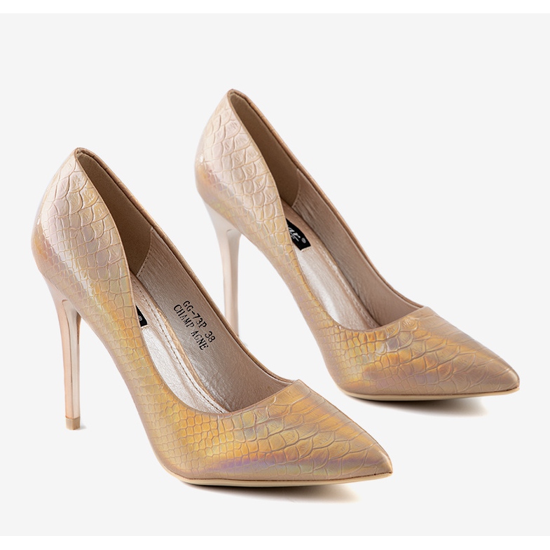 Los tacones altos Pink Craigie serán un acento perfecto para los conjuntos de verano y primavera. El modelo en color champán seguramente se adaptará a las últimas tendencias, y su punta puntiaguda y su ausencia de estampado hacen que los zapatos sean elegantes y universales.