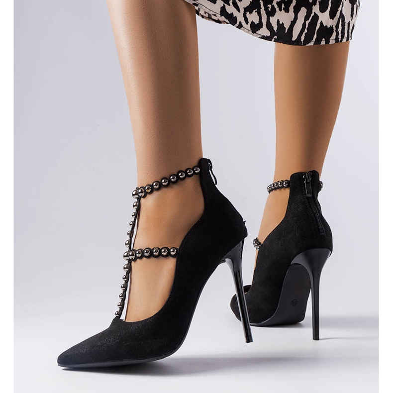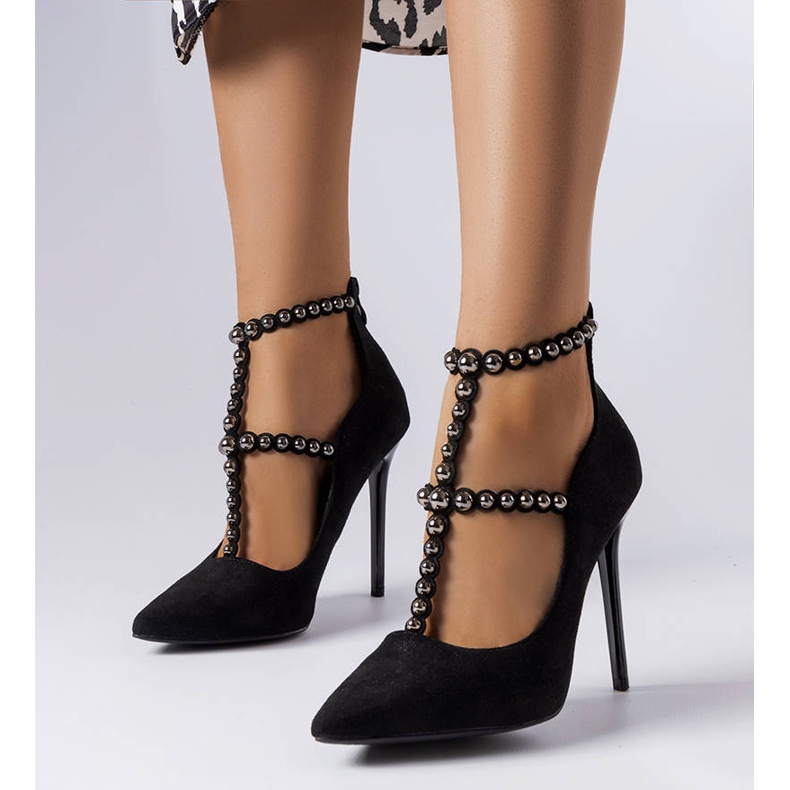La estabilidad y el aspecto elegante de los tacones altos se acentúan con el tacón fino y la punta en punta, que armonizan con el armonioso diseño. Un toque atractivo lo aporta la decoración en forma de tiras de imitación de circonitas, un detalle sutil que llama la atención y enriquece el aspecto de cualquier estilismo.