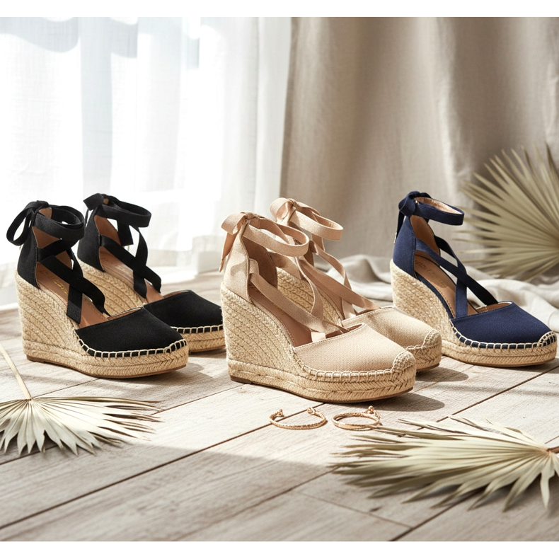 El elemento clave de estos zapatos es una suela hecha de hilo trenzado (yute) y una atadura alrededor del tobillo (a menudo con una cinta). La cuña proporciona estabilidad y comodidad de la que carecen los tacones finos y al mismo tiempo añade unos centímetros de altura y adelgaza la pantorrilla. Estos zapatos son perfectos para paseos festivos, citas y fiestas de verano.