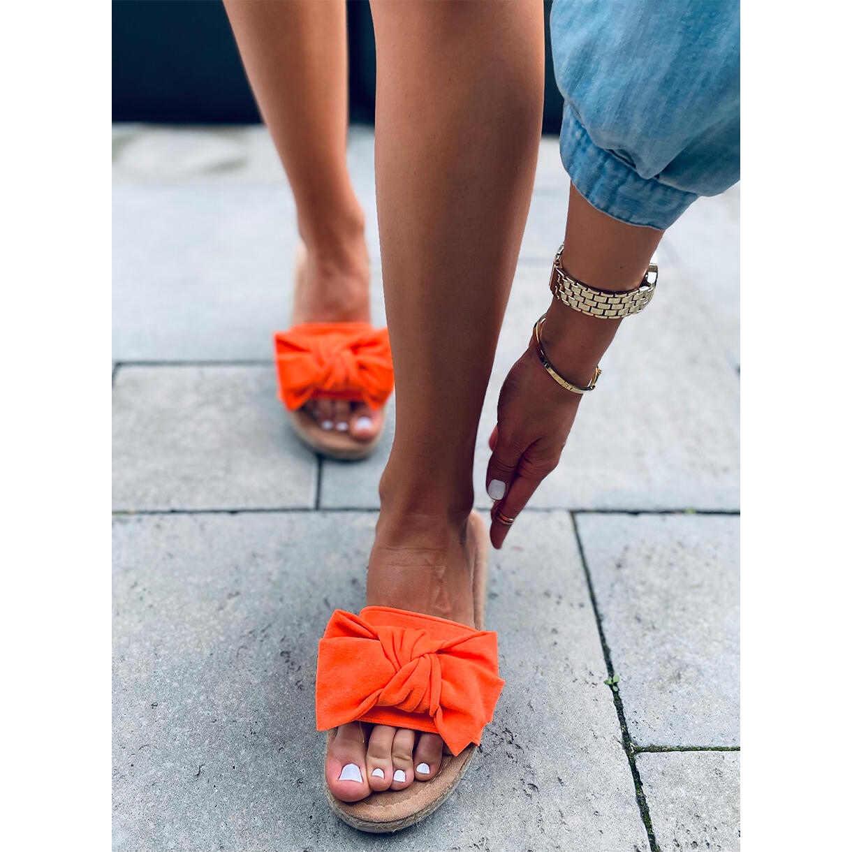 Descubre el encanto único de las chanclas tipo alpargata Viola Orange, que pueden convertirse en tu nuevo elemento favorito de tu guardarropa diario. Estas babuchas de mujer de ante en un tono naranja radiante deleitan por su sencillez y elegancia. Un hermoso lazo en la parte delantera añade encanto y los distingue de otros modelos.