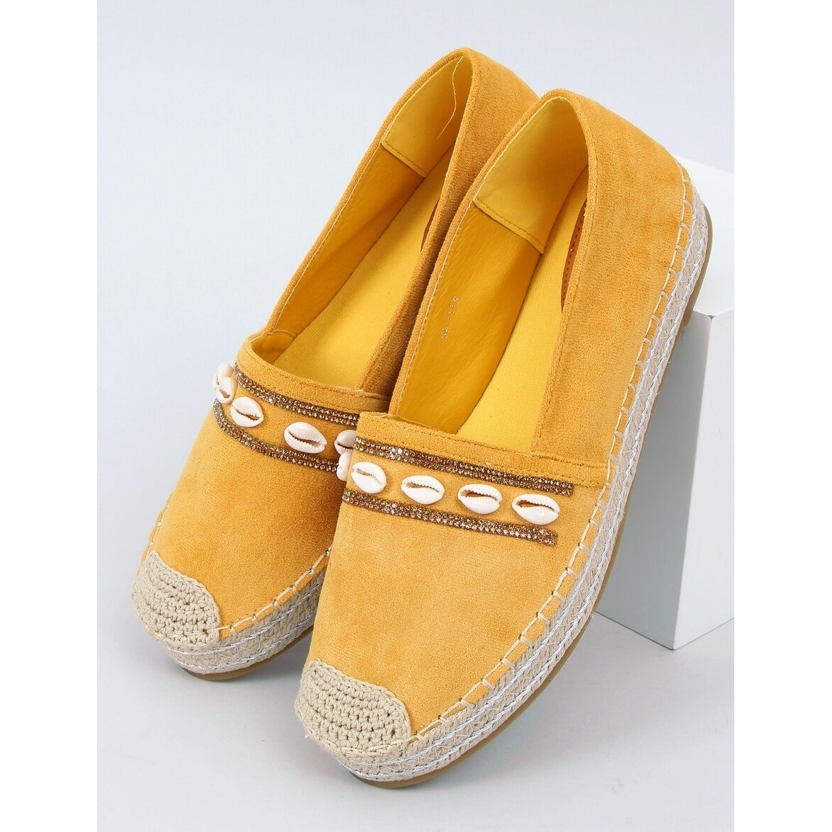 Descubra las alpargatas con conchas Ocean Yellow: la elección perfecta para las mujeres que desean combinar comodidad con un look moderno. Estas singulares alpargatas amarillas con suela alta se distinguen por un cordón de lino trenzado y una puntera redondeada, lo que les aporta ligereza y elegancia. Decoradas con piedras brillantes y hermosas conchas, son un acento perfecto para el estilo veraniego.