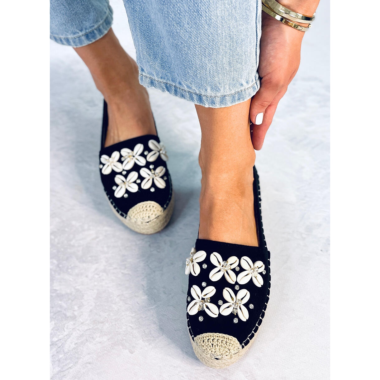 Las alpargatas Elif Black con conchas son un imprescindible en el armario de verano de toda mujer que quiera combinar estilo con comodidad. Estos elegantes zapatos planos con plataforma se distinguen por su diseño único, gracias a la hermosa aplicación de conchas y piedras, que atrae la atención y les da un carácter único.