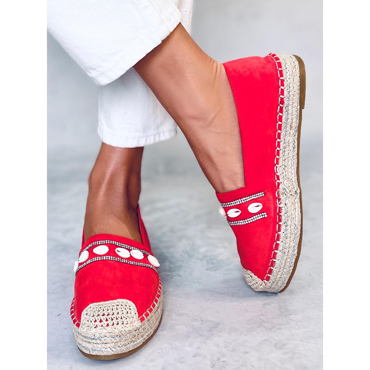 Las alpargatas se caracterizan por tener punteras redondeadas cuidadosamente tejidas con hilo de lino, lo que les da un aspecto único. Un atractivo adicional son las hermosas aplicaciones de piedras brillantes y conchas, que combinan bien con el color intenso de los zapatos, llamando la atención y añadiendo un ambiente veraniego a todo el estilismo.