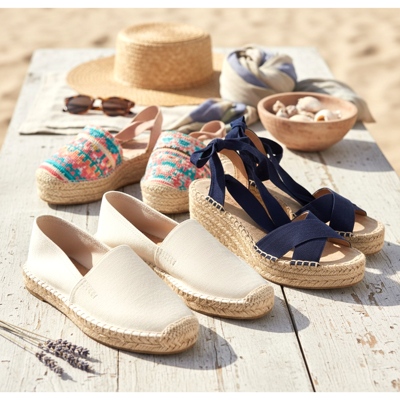 Las alpargatas son extremadamente versátiles. Los modelos planos son perfectos para la playa, un paseo por el paseo marítimo y las salidas cotidianas. Llévalos con pantalones de lino, shorts vaqueros y vestidos holgados. Las alpargatas blancas o beige crean un dúo armonioso con colores pastel y estilo náutico.