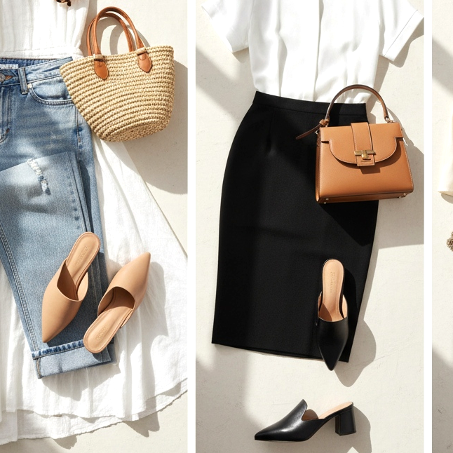 cada día. Los mules planos de piel en negro, blanco o beige son la elección perfecta para las salidas diarias. Llévalos con vaqueros remangados, pantalones de lino y vestidos holgados. Añade un bolso de paja y gafas de sol y tendrás un look listo para un día de verano.