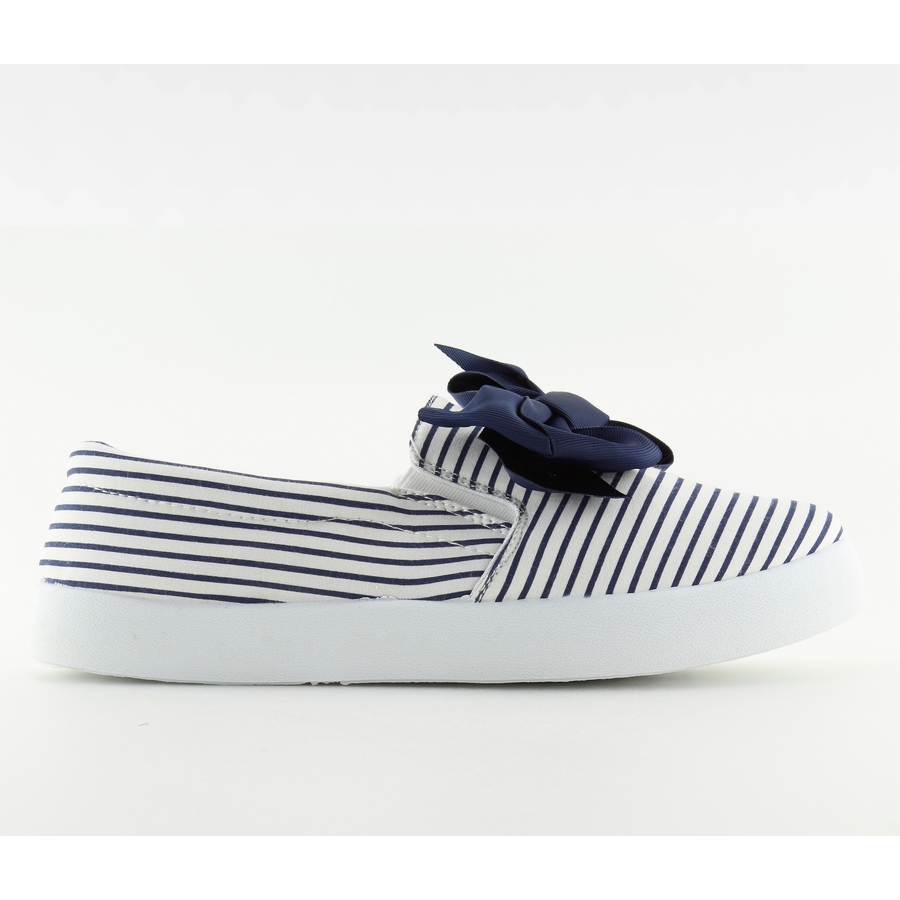Zapatillas deportivas para mujer en corte slip-on en estilo marinero. El encanto se ve reforzado por un hermoso arco y una suela blanca en un estilo deportivo. Ellos lo distinguirán de la multitud y agregarán un carácter único a sus estilizaciones de vacaciones y definitivamente se convertirán en el compañero favorito de los viajes de verano. Están hechos completamente de tela.