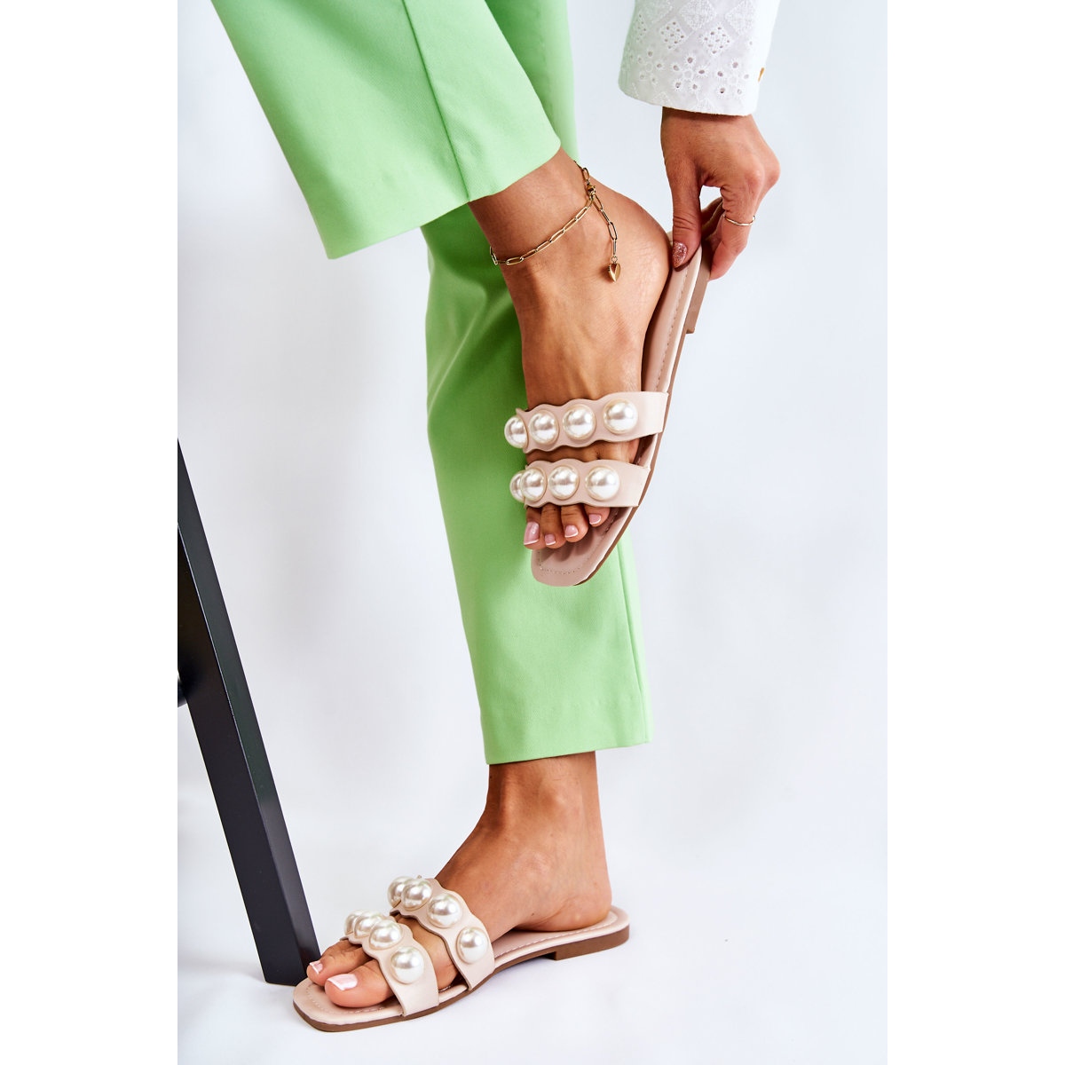 Elegantes babuchas de mujer fabricadas en piel ecológica. Tienen adornos en las tiras en forma de perlas de imitación. Una plantilla suave hecha de cuero ecológico. Abierto, puntera cuadrada. Los zapatos estaban montados sobre un tacón plano. La suela está hecha de material de goma, que además es antideslizante. ¡Un modelo sólido, perfecto para los días de verano! Al elegir una talla, utilice la tabla de tallas.