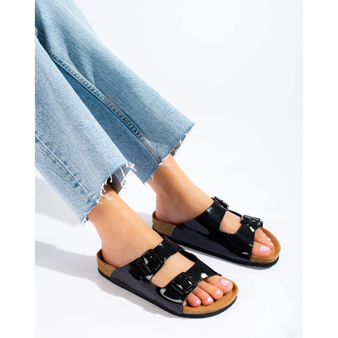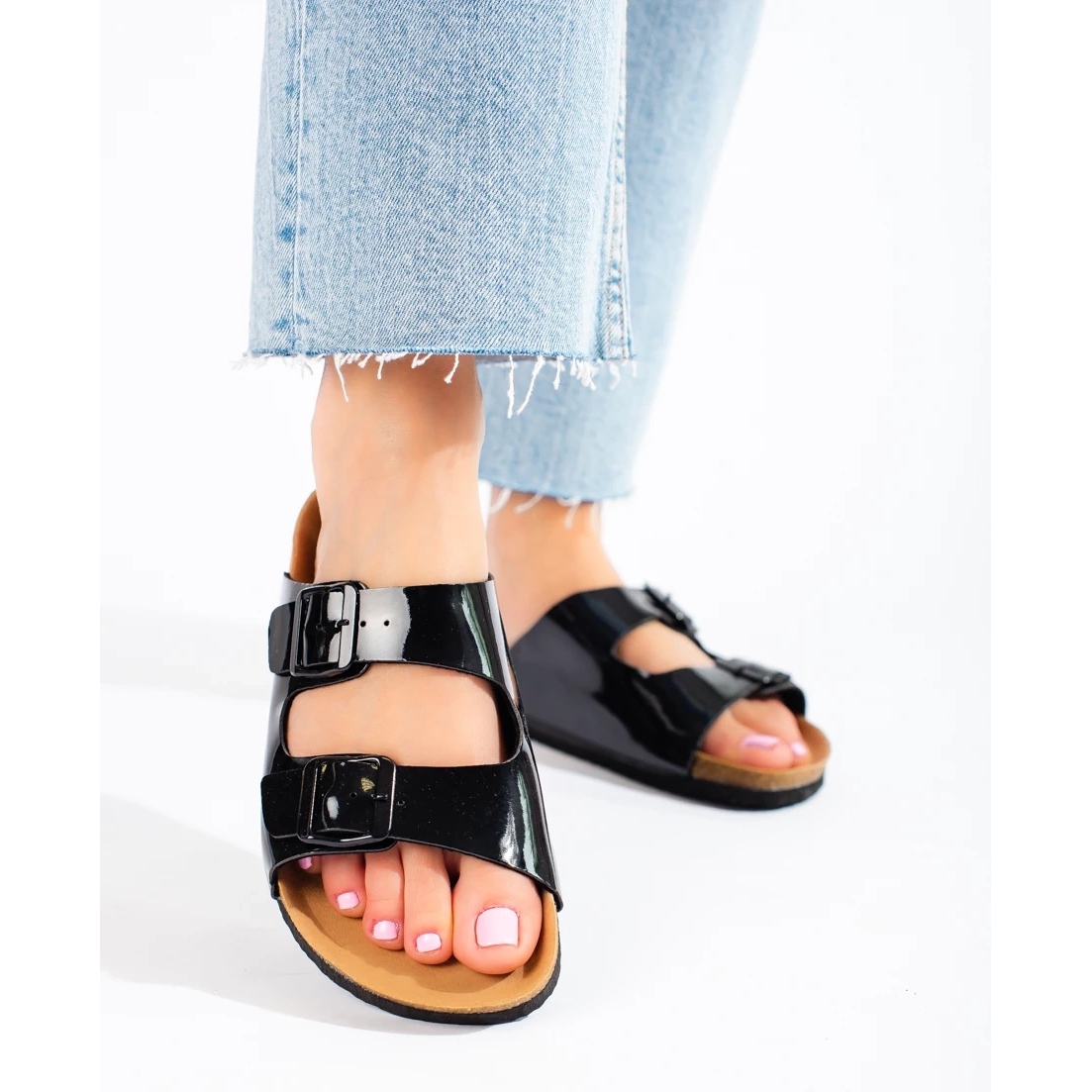 Las chanclas se caracterizan por un tacón abierto y un diseño sin cordones, lo que las hace extremadamente prácticas y fáciles de poner. Fabricados en charol ecológico, no sólo tienen un aspecto único, sino que también garantizan la comodidad de uso.