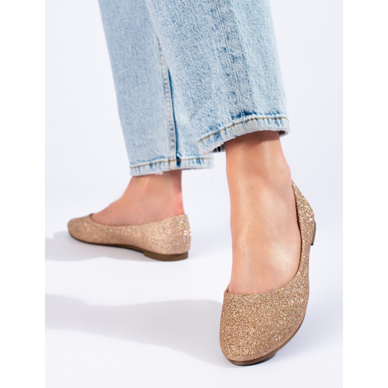 Las ventajas de estas bailarinas no son sólo su precioso color dorado, sino también la alta calidad de los materiales. La parte superior está hecha de tejido textil y la suave aplicación de cuero garantiza un uso cómodo durante todo el día. La punta redonda y el talón suave incorporado brindan comodidad, y el cierre deslizante permite ponérselo y quitárselo rápidamente.