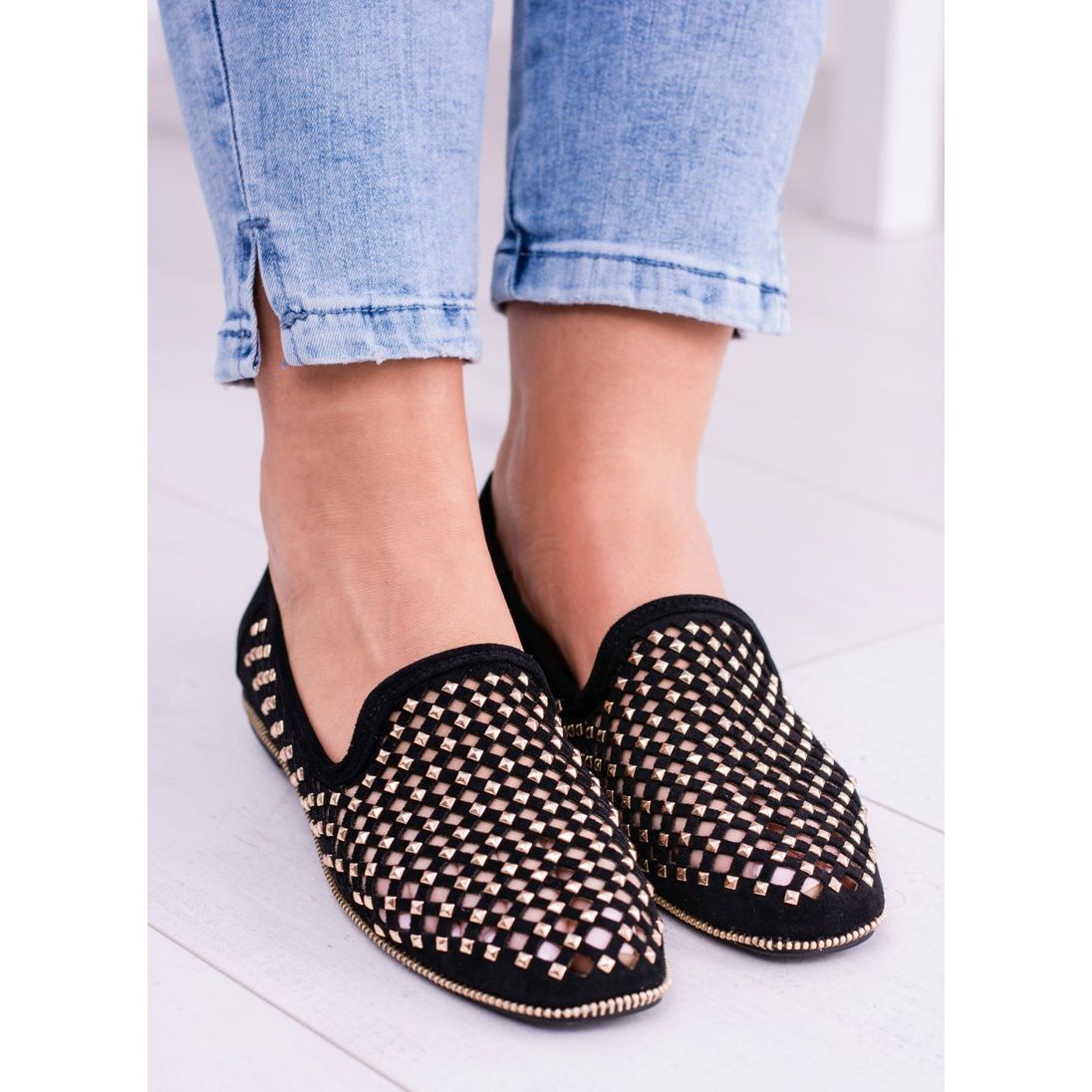 ¡Descubre un estilo extraordinario con las bailarinas negras caladas Lu Boo que sin duda resaltarán tu personalidad! Confeccionados en ante ecológico de alta calidad, estos elegantes señores combinan comodidad y diseño moderno. El patrón calado, decorado con tachuelas de moda, les da un carácter único, haciéndolos perfectos para los días y las noches de verano.