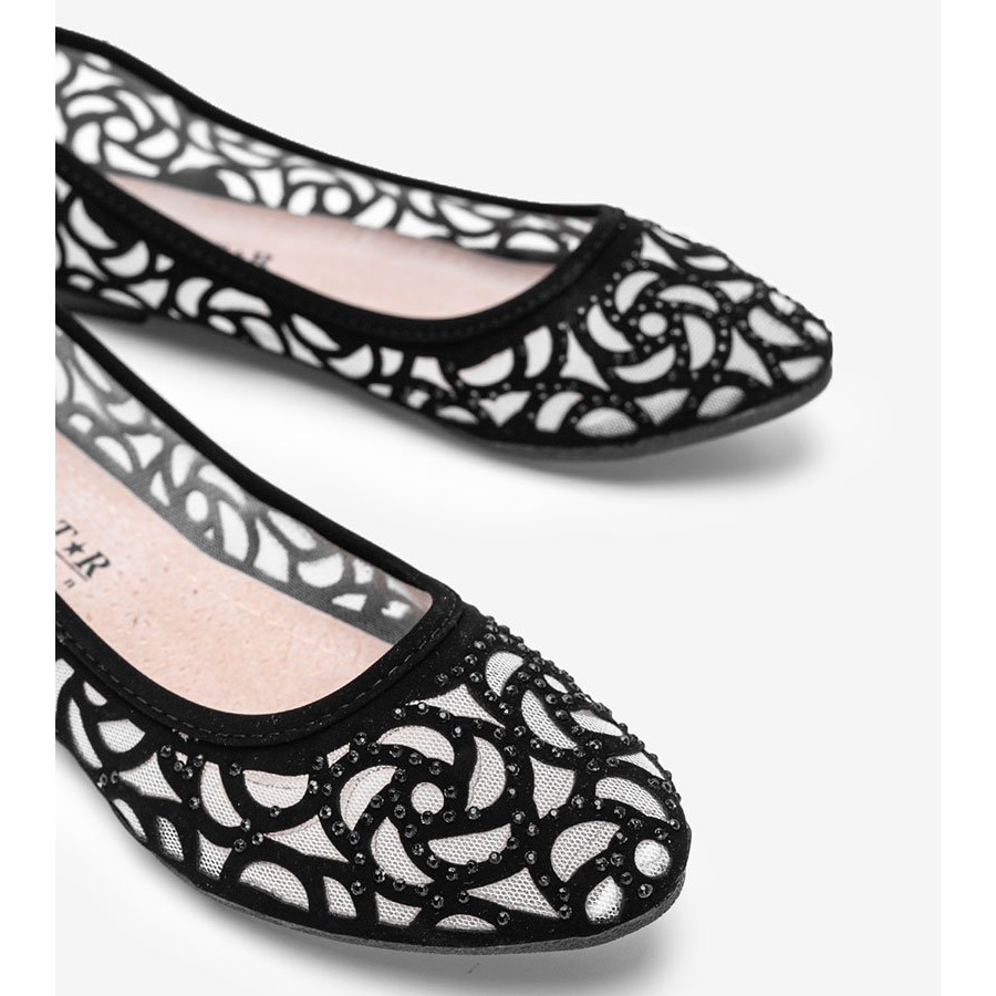 ¡Vamos bailarinas! modelo de calzado elegante y muy femenino. La parte superior está hecha de malla que está decorada con un hermoso patrón calado con flores de cuero de gamuza ecológica. El brillo lo dan los pedrería negros maravillosamente relucientes. ¡Vamos! Serán perfectos como calzado tanto para el trabajo como para una salida nocturna a la ciudad cuando te centres en la comodidad :) Numeración subestimada, te sugerimos elegir una talla más grande.