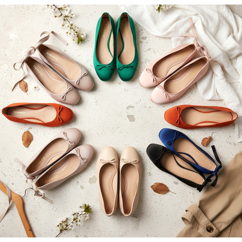 La paleta de colores de las bailarinas de la temporada 2026 es impresionantemente amplia. Los tonos clásicos nude, beige y negro siguen siendo absolutamente imprescindibles: son colores que combinan con todo y son perfectos para cualquier ocasión.