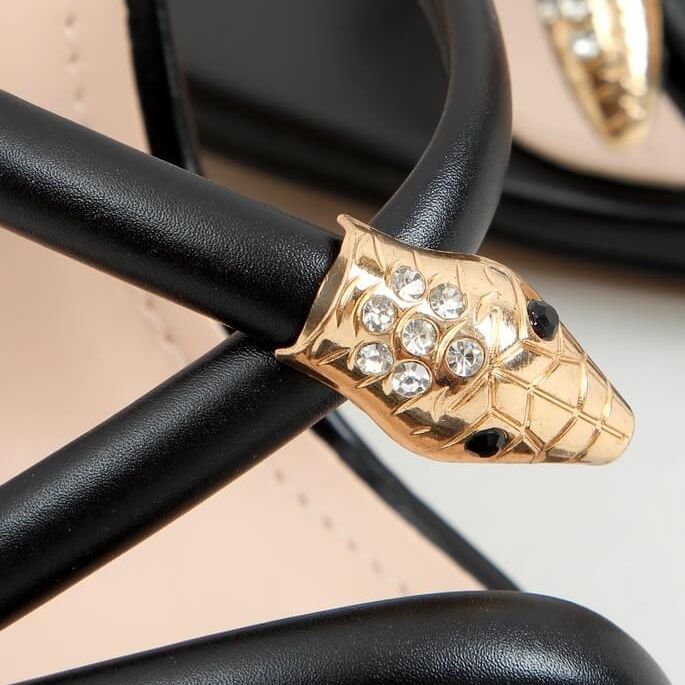Descubre una extraordinaria combinación de elegancia y sofisticación con el mule de tacón negro M311P Black. Estas exclusivas pantuflas de piel flor para mujer deleitan no solo por su silueta esbelta, sino también por sus impresionantes adornos en forma de detalles de serpiente y pedrería. Con una altura de tacón de 11,5 cm, estas chanclas alargan visualmente tus piernas, añadiendo clase y elegancia a cualquier conjunto.