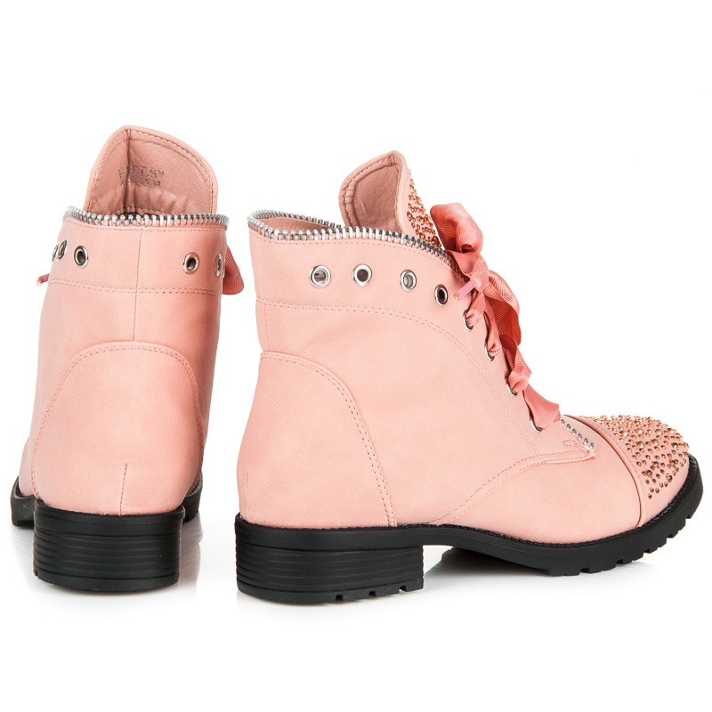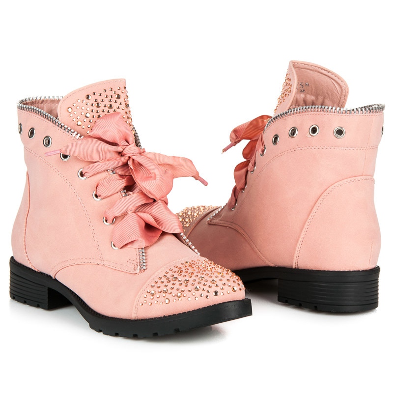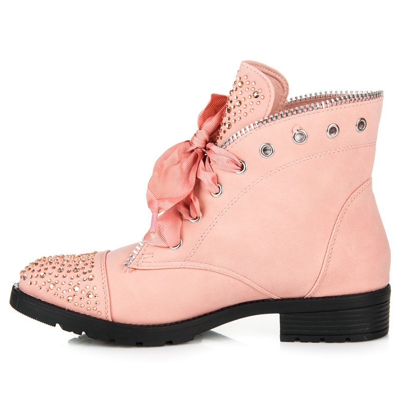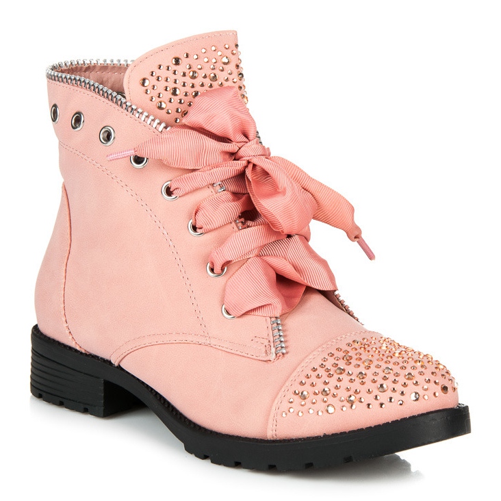 Descubra la última colección de Vices New Collection: trabajadores elegantes con una cinta en un moderno color rosa. Perfecta para mujeres que quieren combinar comodidad con un estilo único. Estos botines se distinguen no sólo por un tacón plano de 3 cm de altura, sino también por sus pedrería que les dan un carácter único.