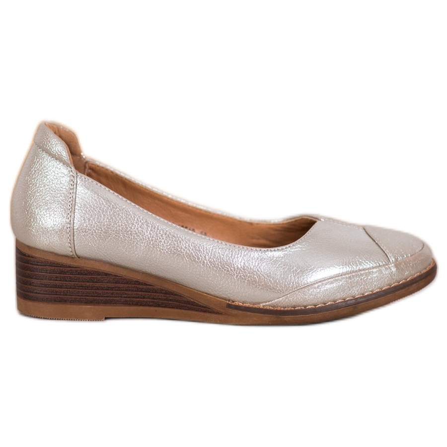 Descubra la elegancia y la comodidad en uno con zapatos de tacón con cuña dorada de Vinceza. Estos elegantes zapatos, fabricados con un material estético similar al cuero, son el complemento perfecto para muchos conjuntos de primavera y verano. Su acabado metálico brillante te hará sentir especial en cualquier ocasión.
