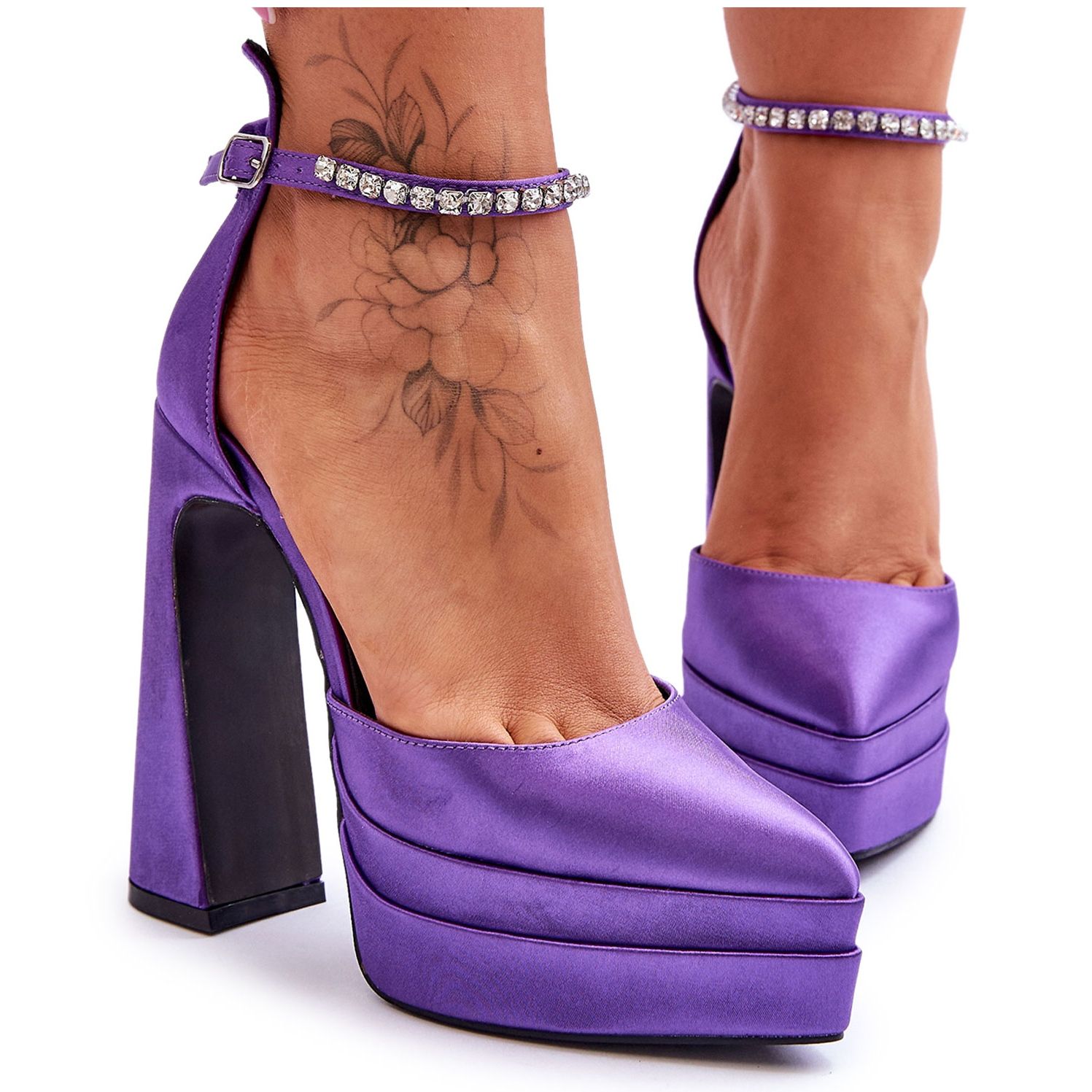 La punta puntiaguda no sólo le da a los zapatos un perfil clásico y bien formado, sino que también refleja las últimas tendencias en moda de calzado. Los zapatos de salón están equipados con una elegante correa decorada con circonitas, que aportan un brillo sutil al conjunto y enfatizan el carácter exclusivo del modelo. La hebilla no sólo proporciona una sujeción cómoda, sino que también permite un fácil ajuste, gracias a lo cual los zapatos se adaptan perfectamente al pie.