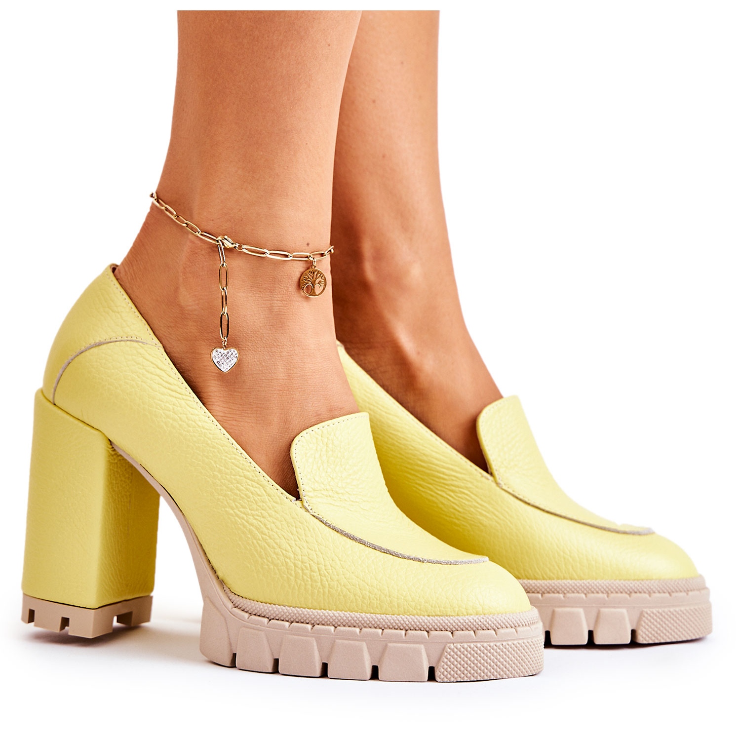 Descubra lo clásico y la modernidad en uno: zapatos de tacón de moda con plataforma enorme en amarillo de la marca Margott. Estos elegantes zapatos de salón llaman la atención no sólo por su diseño moderno, sino también por la comodidad que ofrecen gracias a soluciones prácticas. Con un tacón de bloque y una plataforma estable, garantizan comodidad y confianza en cada paso.