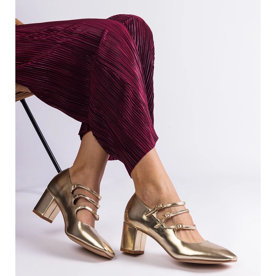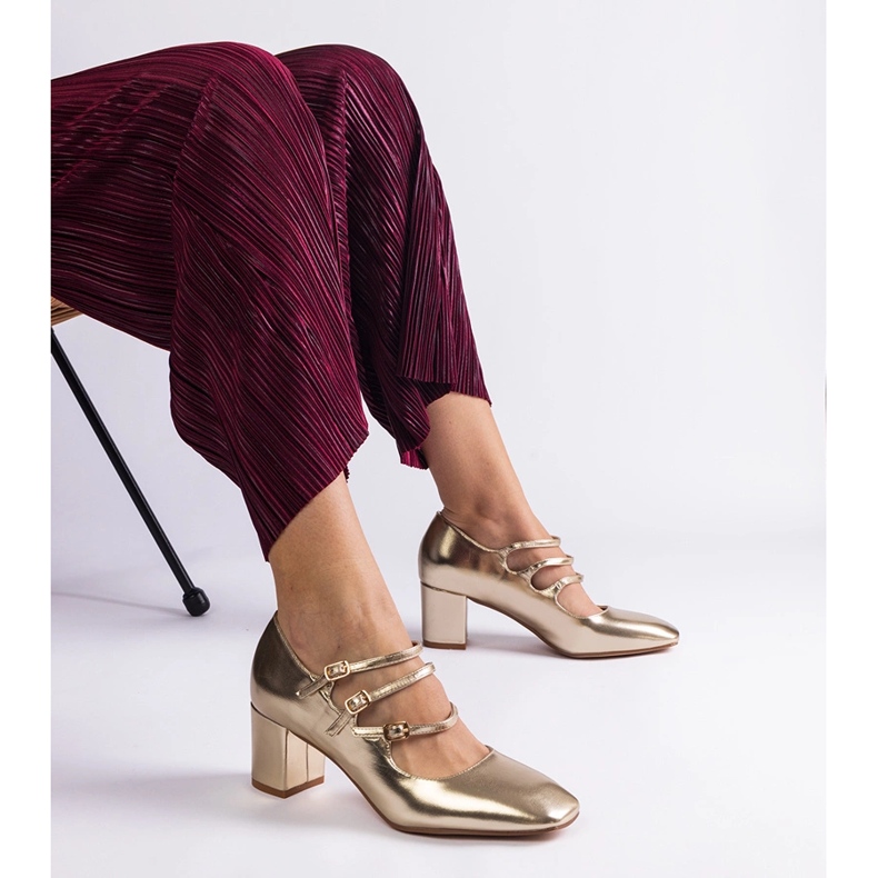 Las bombas doradas en una publicación con hebillas decorativas son una propuesta ideal para las mujeres que desean combinar la moda con comodidad. Estos elegantes zapatos se distinguen no solo por un hermoso color dorado, sino también con un diseño moderno, gracias a una NOSC cuadrada y un acabado metálico. El cuero orgánico de alta calidad hace que las bombas no solo sean duraderas, sino que también sea agradable de usar.