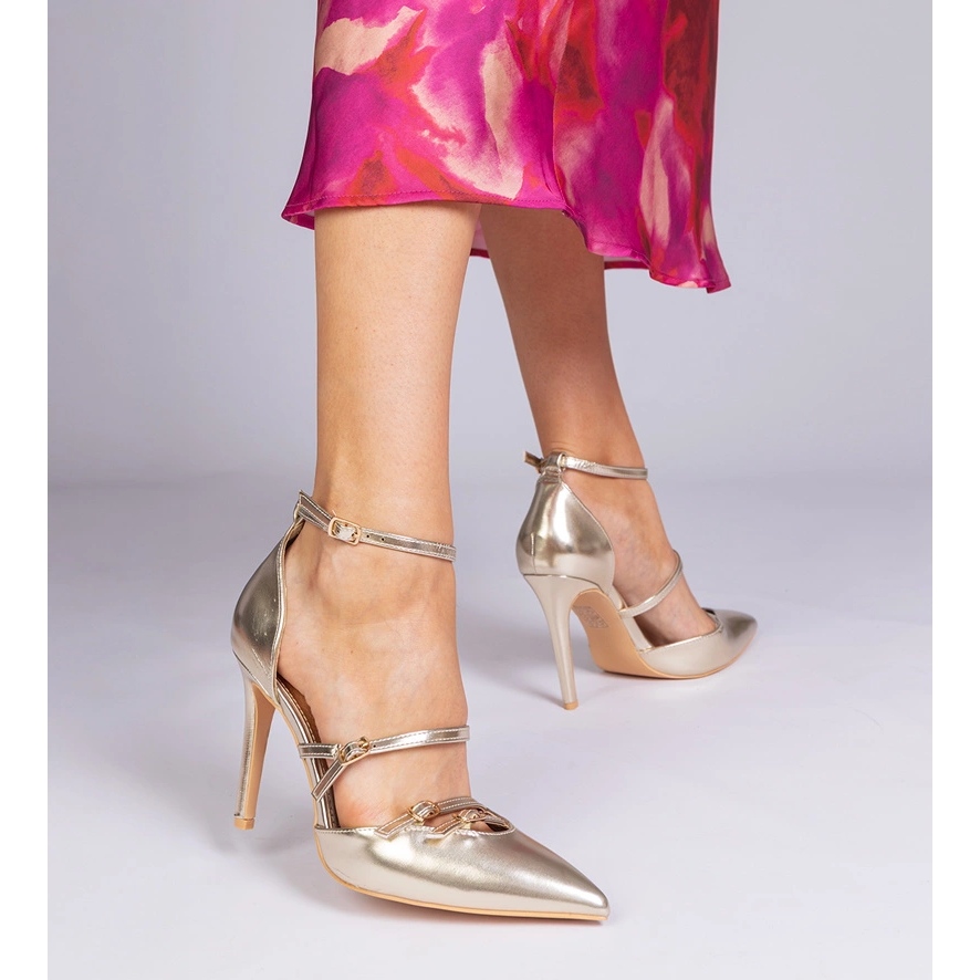 Inna marka Bombas de oro en un tacón alto sujetado alrededor del tobillo dorado