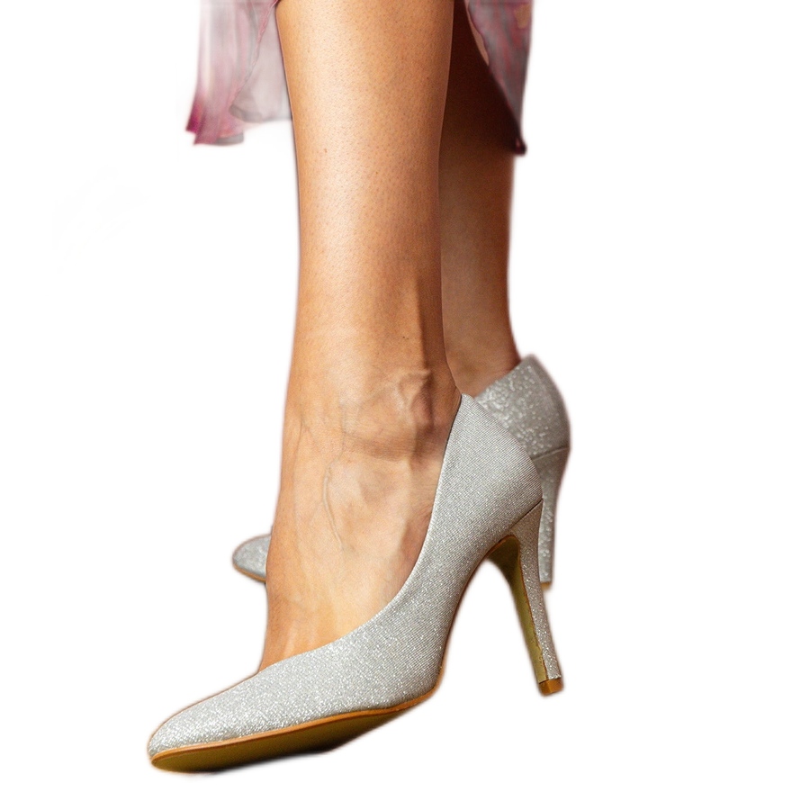 El acabado de brillo en plata hace que las bombas sean ideales para muchas ocasiones especiales, desde bodas elegantes, a través de eventos ocasionales, hasta tardes románticas. Un dedo de almendra clásico y un cómodo en el suministro de deslizamiento proporcionan no solo una apariencia estética, sino también la comodidad del uso.