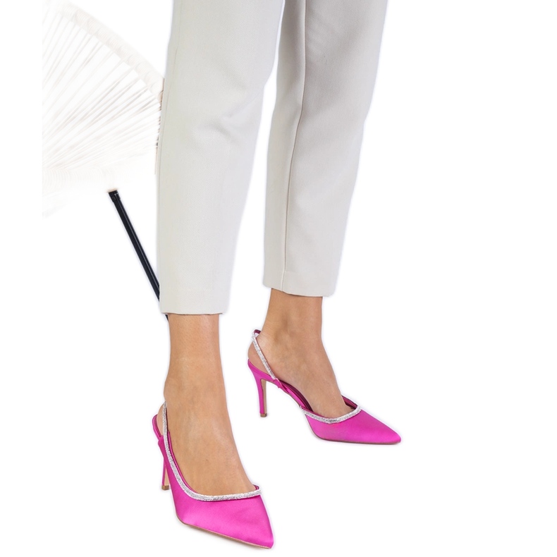 Detalles: Bombas de satén rosadas con circones con un tacón abierto