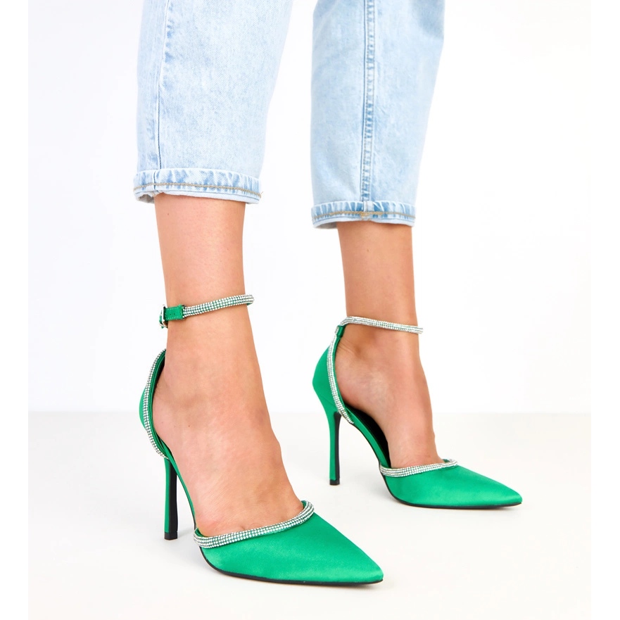 Detalles: Bombas de satén verde con circones sujetos con tobillo Zizia