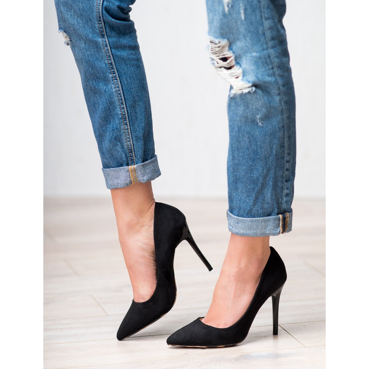 Los zapatos de tacón alto de Erynn son la quintaesencia de elegancia y feminidad. Confeccionados en ecopiel de alta calidad imitando ante, estos clásicos zapatos negros son la elección perfecta para ocasiones especiales. Su puntera cónica y su suela perfilada se adaptan perfectamente a la forma del pie, garantizando comodidad de uso.