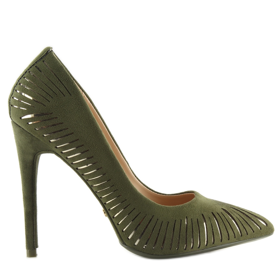 Descubre la elegancia y el estilo único de los zapatos de tacón oliva LE016P en un precioso tono verde. Estos zapatos de mujer únicos con un tacón fino de 11 cm combinan un diseño moderno y comodidad de uso. Confeccionados en ante ecológico, los zapatos de salón llaman la atención con recortes calados y detalles plateados brillantes, lo que les da originalidad.