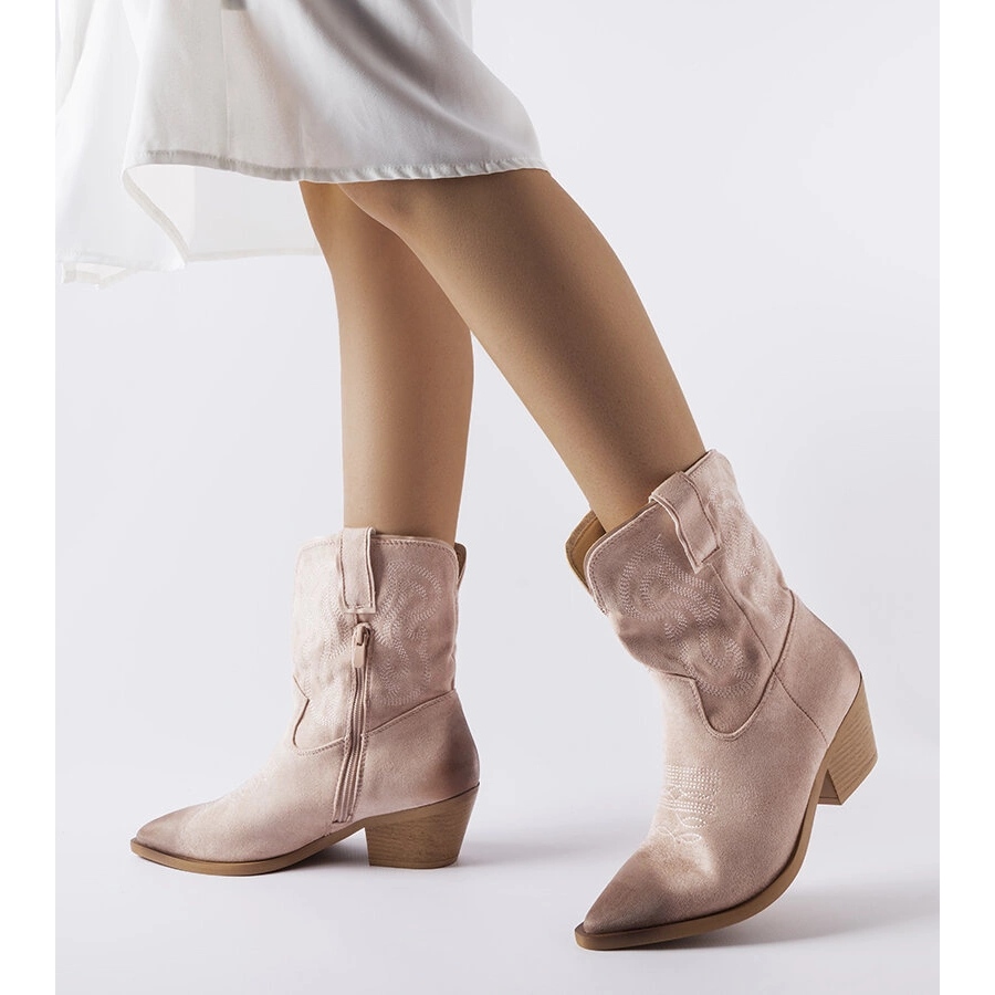 Expresivas y universales - Ernestine Botas son botas de vaquero hechas de cuero de gamuza ecológica de alta calidad, que complementará perfectamente estilizaciones casuales y más femeninas. La característica superior, redondeada, un bloque de corte con una altura de 5 cm y bucles de cinturón que facilitan ponerse la naturaleza de los zapatos de los zapatos, y el color rosa les agrega notas de moda.