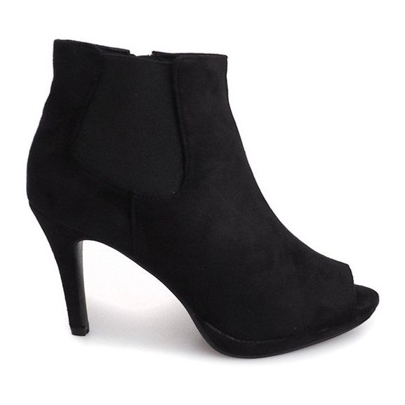 Los botines negros con punta abierta son extremadamente universales: combinan tanto con atuendos casuales como con atuendos más elegantes. La cremallera facilita su calce y la comodidad de uso está garantizada por una suela sintética y una plantilla de otro material. Un acento interesante es la falta de nariz, lo que les aporta ligereza.