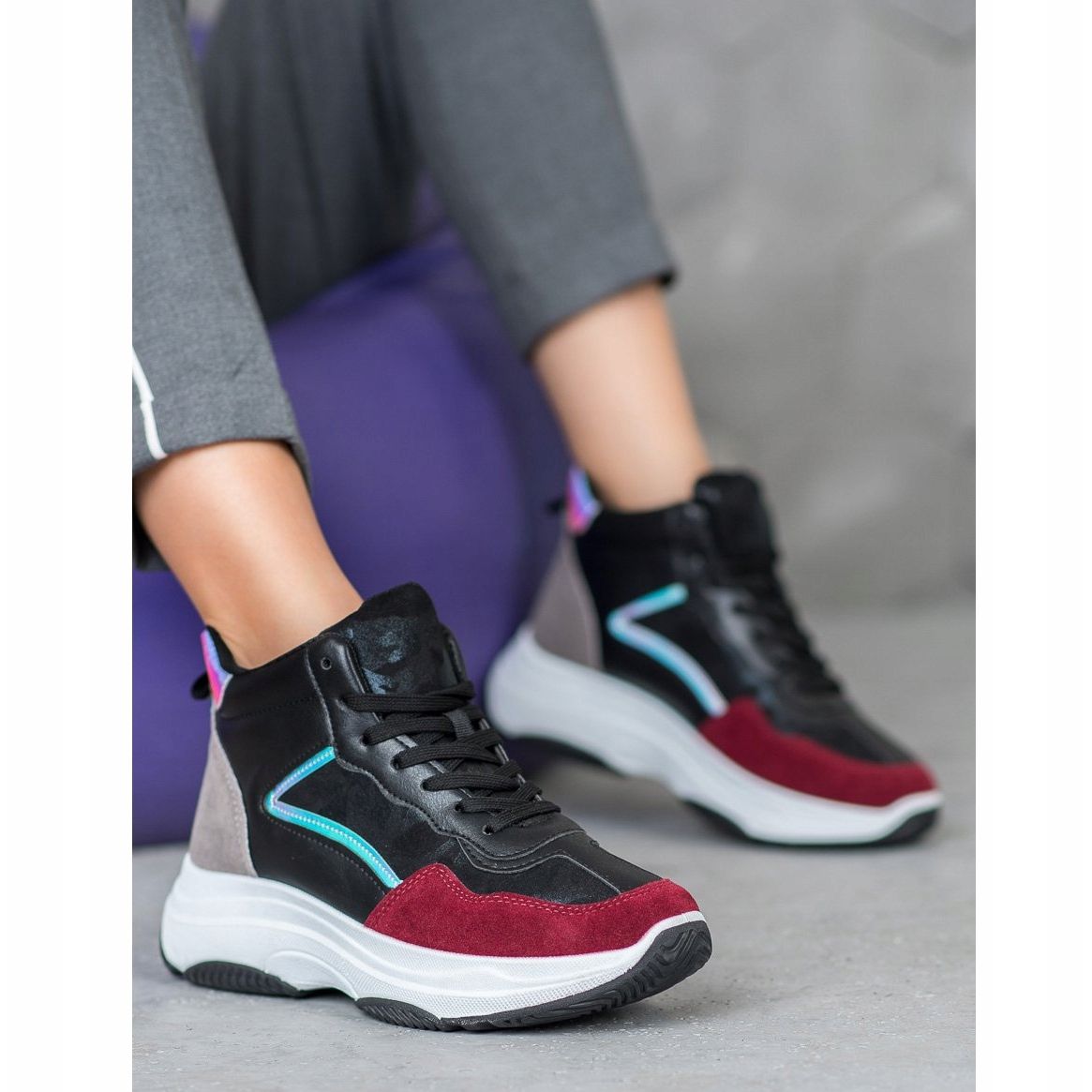 Estos zapatos deportivos únicos para mujer han sido diseñados prestando atención al detalle. La parte exterior de la parte superior está hecha mitad de tela elástica y mitad de material similar al cuero de alta calidad, lo que garantiza no solo una apariencia moderna, sino también durabilidad. Una elegante combinación de colores con una tira de material de color burdeos en la puntera redondeada le da carácter a los zapatos y los hace combinar perfectamente con varios estilos.