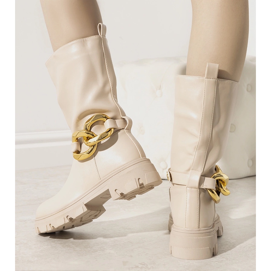 Elegantes botas Beige Harrison son una combinación de un patrón de ruise de moda y un minimalismo atemporal. Hecho de cuero ecológico, con una piel suave y cálida en el interior, asegura la comodidad incluso a temperaturas más bajas. Una cadena decorativa y dorada en la barra alrededor del tobillo agrega carácter y se puede quitar cuando prefiere un aspecto más moderado.