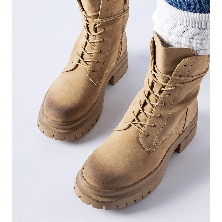 Trapers modernos en color universal, beige que combinan estilo gratuito con soluciones prácticas para la temporada de otoño y invierno. La nariz desgastada les da el carácter y el acento ligeramente "crudo", y la forma redonda de los dedos asegura la comodidad y más espacio para el pie.