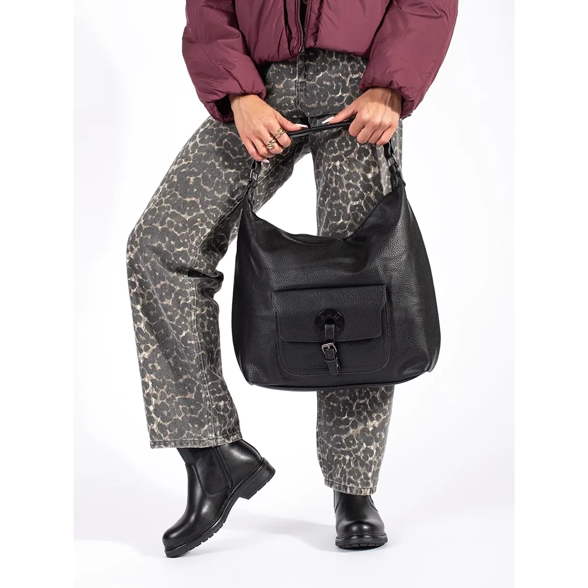 Su diseño minimalista con una nariz redonda y un tacón plano con una altura de 3 cm los hace extremadamente universales. La altura de la parte superior que alcanza el tobillo y construida en el talón les da carácter, y aislamiento y pelaje en el interior los hacen perfectos para días más fríos.