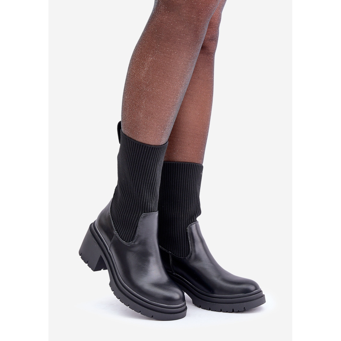 Las botas con un calcetín en un enorme tacón negro es una gran opción para las mujeres que valoran la moda y la comodidad. Estas botas elegantes se distinguen por una parte superior flexible de calcetines que se adapta perfectamente al pie, proporcionando comodidad durante todo el día. Ubicados en un talón estable de 7 cm de altura, trabajarán en estilizaciones cotidianas, así como en ocasiones especiales.