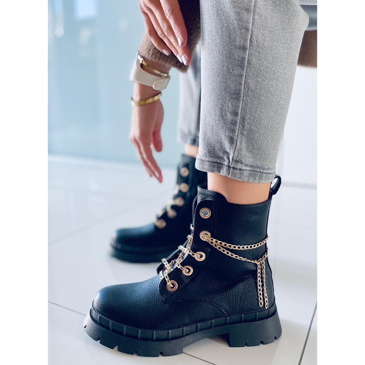 ¡Los botines con cordones Lohan Black son imprescindibles en el armario de cualquier mujer! Estas llamativas botas negras se distinguen por un diseño original que combina comodidad con moda. En lugar de los tradicionales cordones, este modelo está equipado con una elegante cadena dorada, que le aporta un carácter único. El juego también incluye cordones reemplazables, lo que te permite personalizar el aspecto de los zapatos.