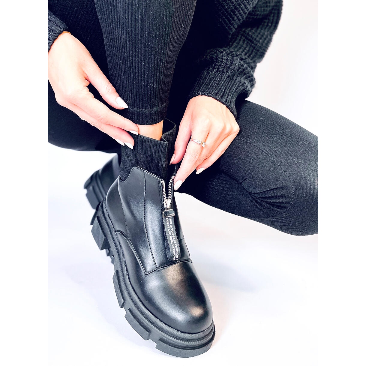 Botas de mujer modernas que combinan comodidad con el estilo. El modelo Dolly Black se distingue mediante una cerradura flexible, superior y una espectacular bloqueo plateado en la parte delantera, perfecta a diario y por estilizaciones urbanas. Una suela gruesa y ligera garantiza la estabilidad y la comodidad de usar todo el día.