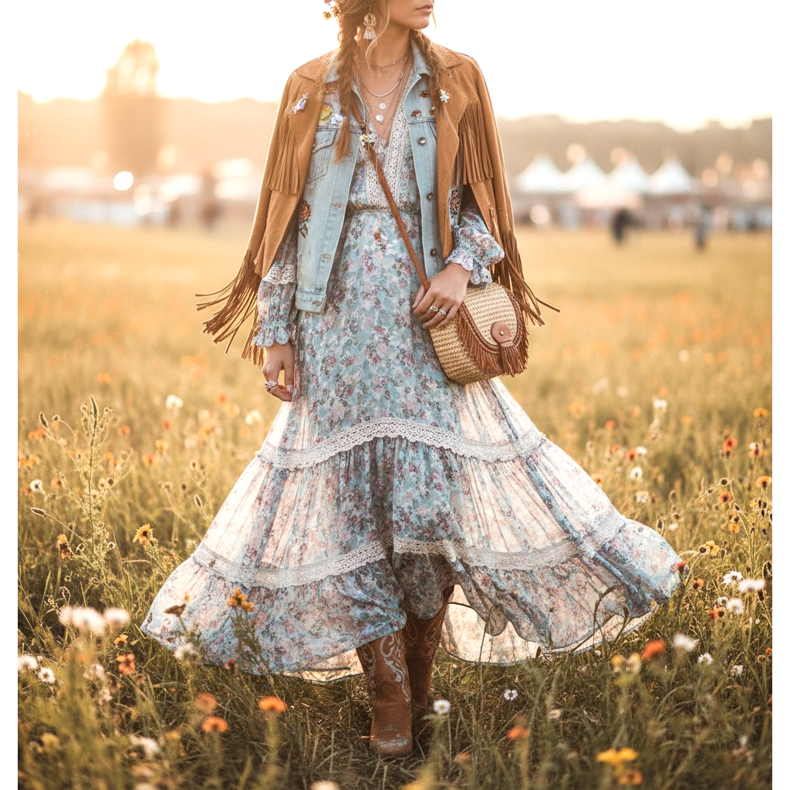 El mejor compañero para las botas vaqueras es un vestido aireado de estilo bohemio. Elige un modelo con flores, volantes o encaje. El contraste entre el pesado zapato de cuero y el delicado material del vestido crea un efecto extremadamente elegante. Añade una chaqueta de ante con flecos o una katana vaquera y estarás lista para un festival o una cita.
