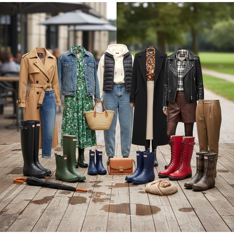 elegancia urbana – Botas de agua Hunter negras clásicas combinadas con una gabardina ajustada, jeans ajustados y un suéter de cachemira. Agregue un bolso de cuero y un elegante paraguas: un atuendo listo para un día lluvioso en la ciudad.