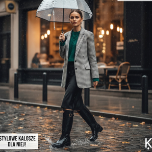 Elegancia bajo la lluvia – botas de agua negras con falda lápiz, blusa de seda y abrigo clásico. Un look profesional que funcionará incluso en la oficina.