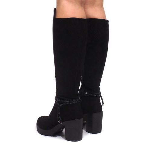 Su corte, de aproximadamente 38 cm de altura, llega hasta la rodilla, lo que los hace combinar perfectamente con pantalones, vestidos o faldas. El uso de gamuza ecológica enfatiza su atractivo y carácter moderno, y el color negro los hace universales: serán un complemento perfecto para muchos estilos.