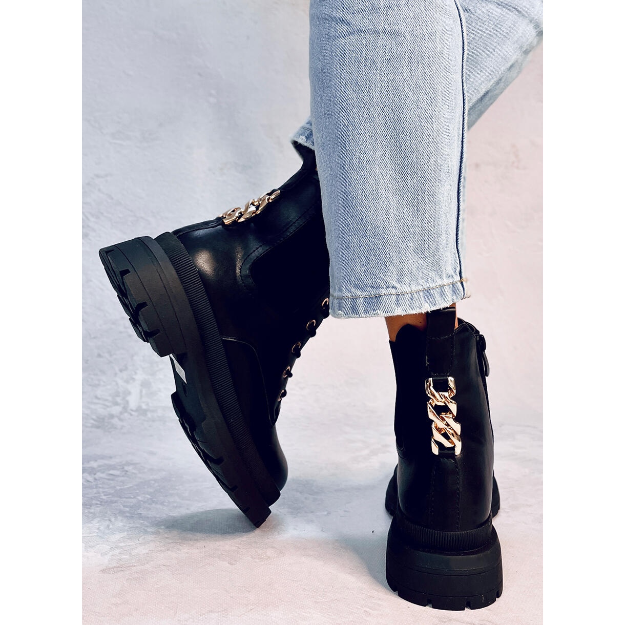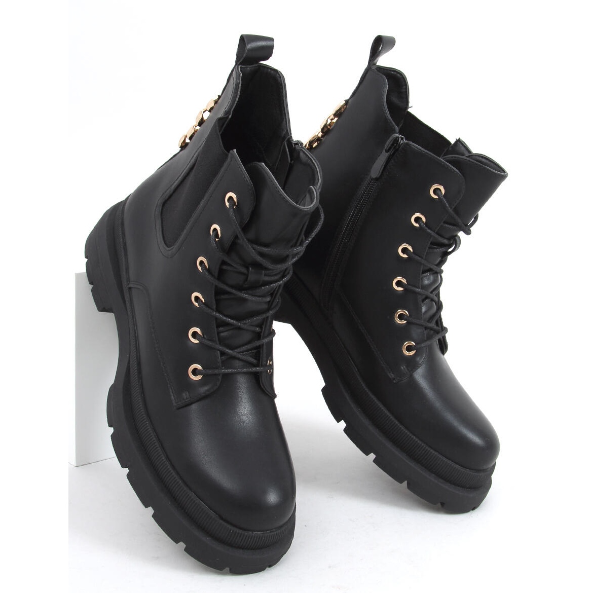 Botas de mujer flor con suela gruesa. Este es un modelo único con la cadena de oro más de moda en la parte posterior de la parte superior, que combina perfectamente con el color negro de los zapatos. Son clásicamente con cordones, por lo que se adaptan perfectamente a la anchura del pie, pero también tienen cremallera en el lateral. Están fabricados en piel ecológica y forrados con un delicado pelo en el interior.
