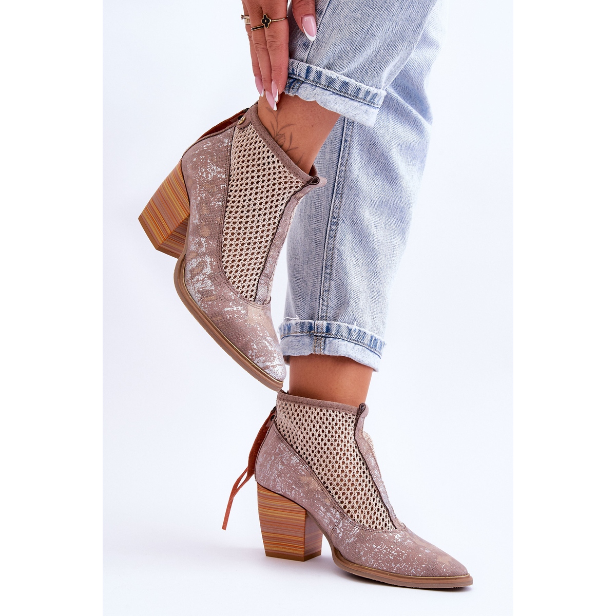 Fabricadas en piel natural de alta calidad, las botas se distinguen no sólo por su estética elegante, sino también por su funcionalidad. La malla decorativa les confiere un carácter ligero y calado, lo que los convierte en una gran elección para primavera, verano y otoño. La clásica cremallera en la parte posterior de la parte superior facilita su calce y el talón rígido proporciona un soporte adecuado para el pie.