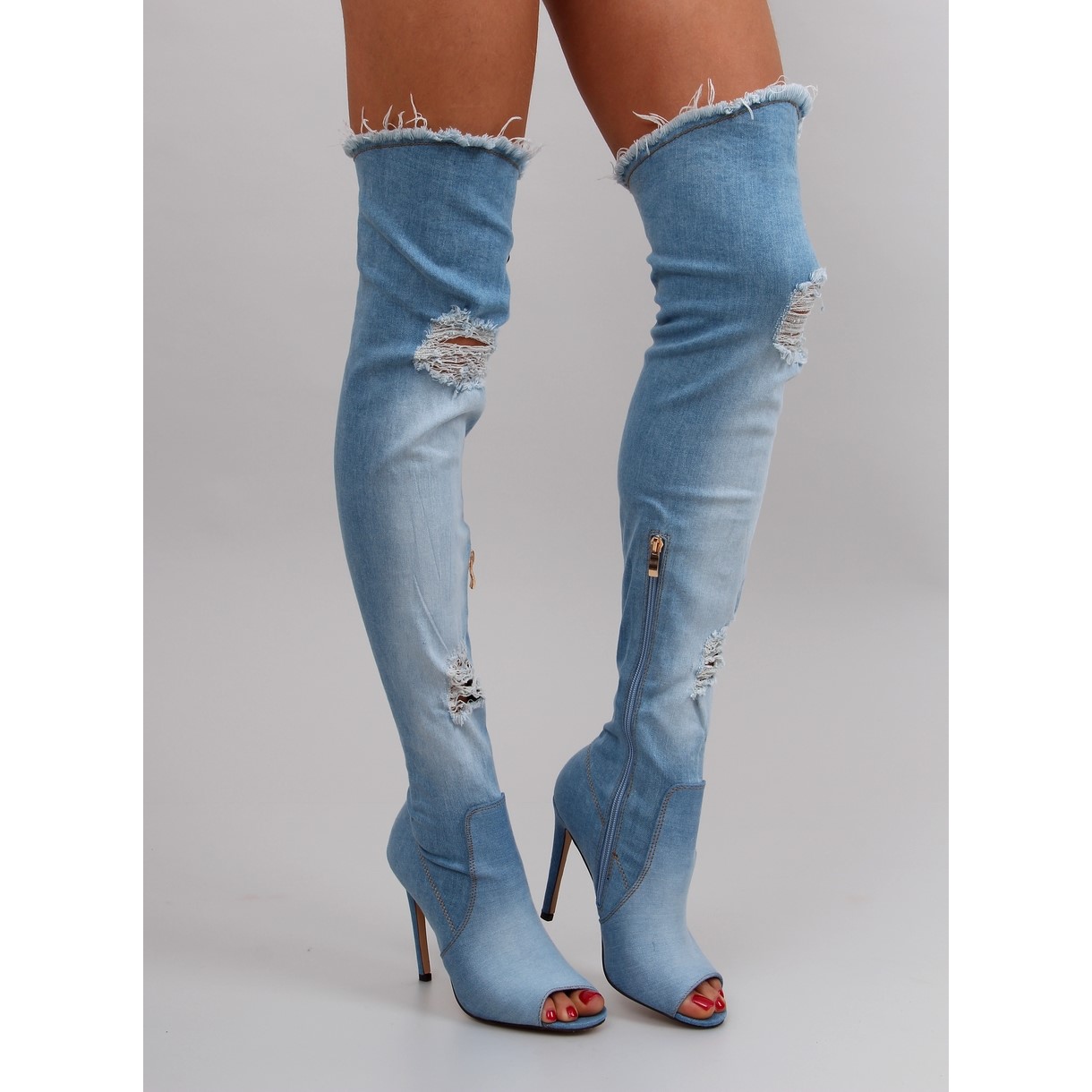 Un modelo fenomenal de la temporada. Hermosas botas hasta el muslo con punta abierta. Tienen un tacón delgado de 11 cm. Están hechos de jeans con una mezcla de elasteno, se ajustan perfectamente a la pierna. En el interior: cremallera para una fácil colocación. Los zapatos se ven increíbles en la pierna. Es difícil quitarles los ojos de encima ...