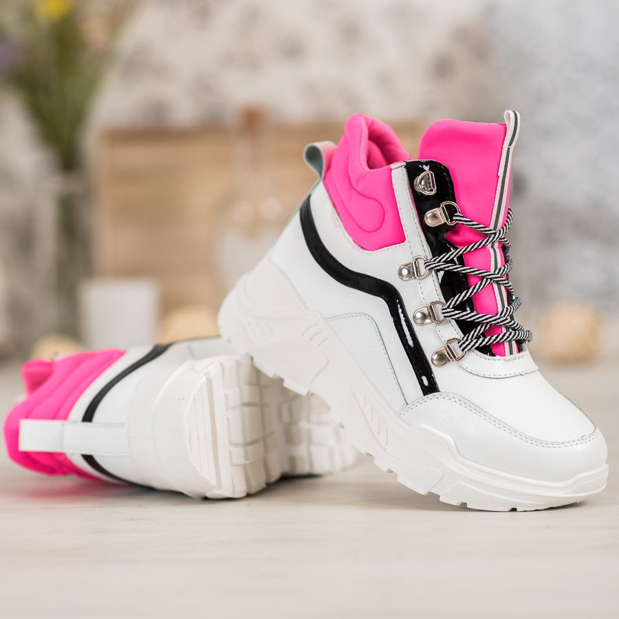Estos botines únicos, destinados a las mujeres modernas, están hechos de piel sintética de alta calidad, lo que garantiza no solo durabilidad sino también comodidad de uso. Su parte principal blanca como la nieve armoniza con el sutil rosa colocado en la parte superior de la pala y la lengüeta, introduciendo un acento de color claro que rompe la uniformidad del blanco.