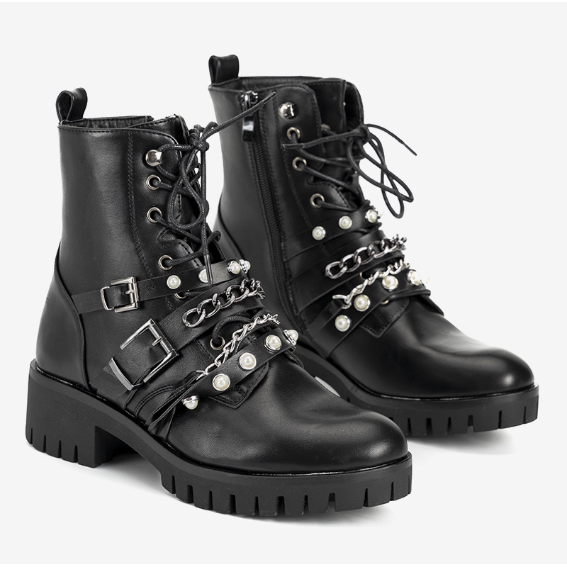 La suela alta tipo tramper es otra ventaja de este modelo, que se adapta perfectamente a las últimas tendencias de otoño e invierno. Los adornos en forma de cinturones e impresionantes cadenas dan a los zapatos un carácter único, lo que los convierte en un complemento perfecto para cualquier estilismo.