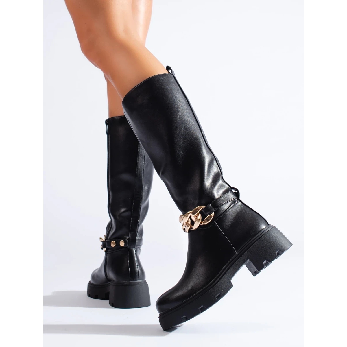 Las botas funcionarán tanto en elegantes estilizaciones (vestido, abrigo) como en combinaciones casuales cotidianas (jeans, suéter de lana). La cadena agrega carácter y una sutil vanguardia, gracias a la cual los zapatos también son excelentes para una noche o celebración.