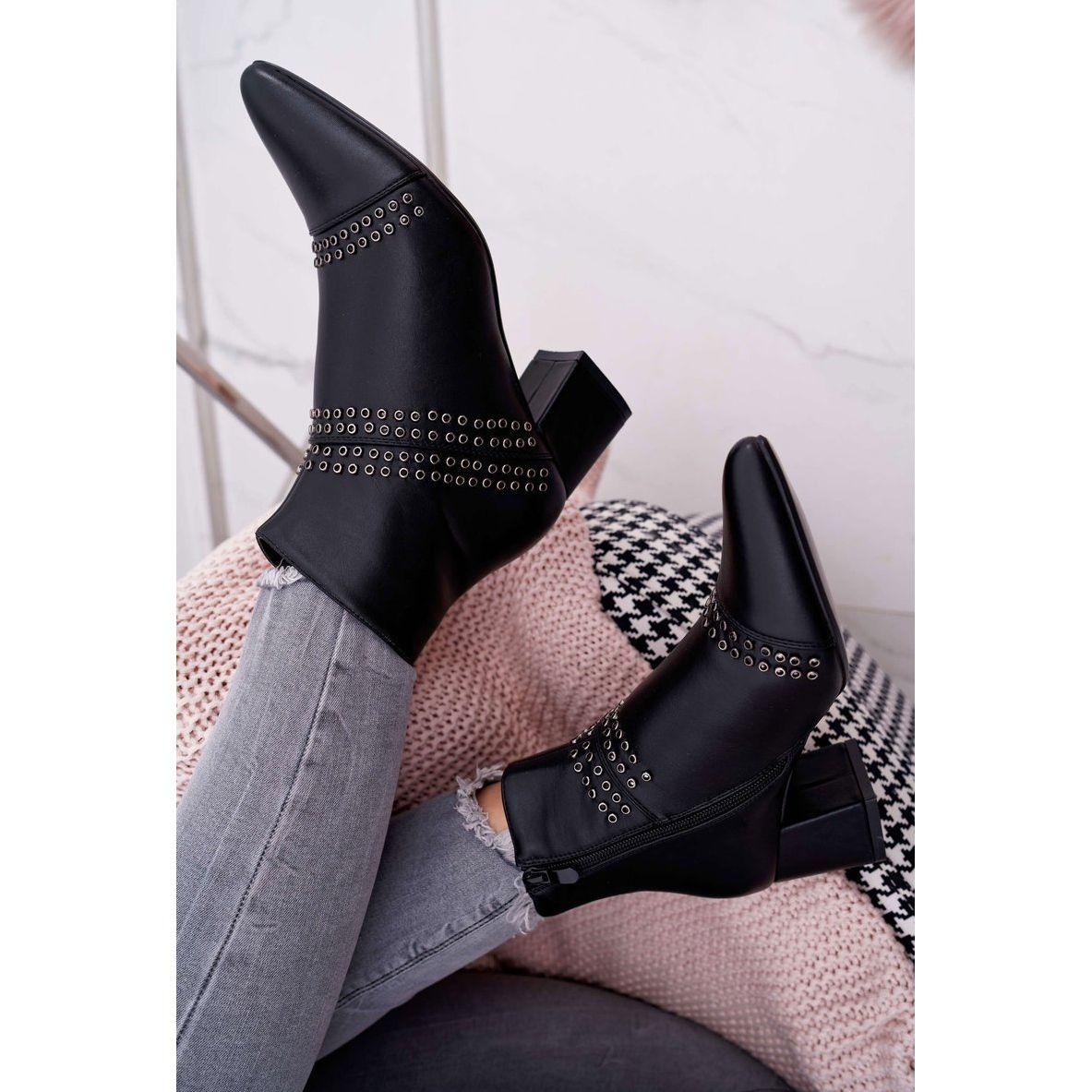 Los adornos en forma de remaches dan a las botas un carácter más fuerte, llamando la atención y aportando un estilo único. La altura del tacón de 5,5 cm en bloque los hace no sólo elegantes, sino también cómodos de llevar durante todo el día. Las botas llegan hasta el tobillo, lo que resalta aún más su corte femenino.